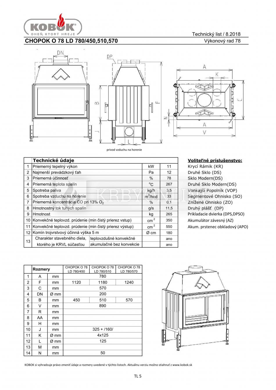 Kobok Chopok O 780/450 510 570 - teplovzdušná, obojstranná, krbová vložka s otváraním do boku. Oceľové vykurovacie teleso so šamotovým ohniskom, s možnosťou zadného prikladania.